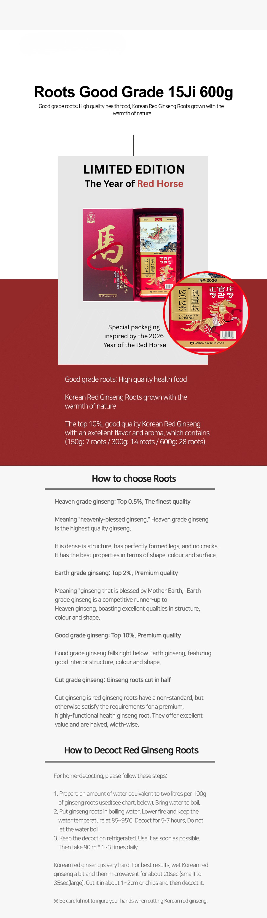 The top 10%, good quality Korean Red Ginseng with an excellent flavor and aroma, which contains (150g: 7 roots / 300g: 14 roots / 600g: 28 roots).